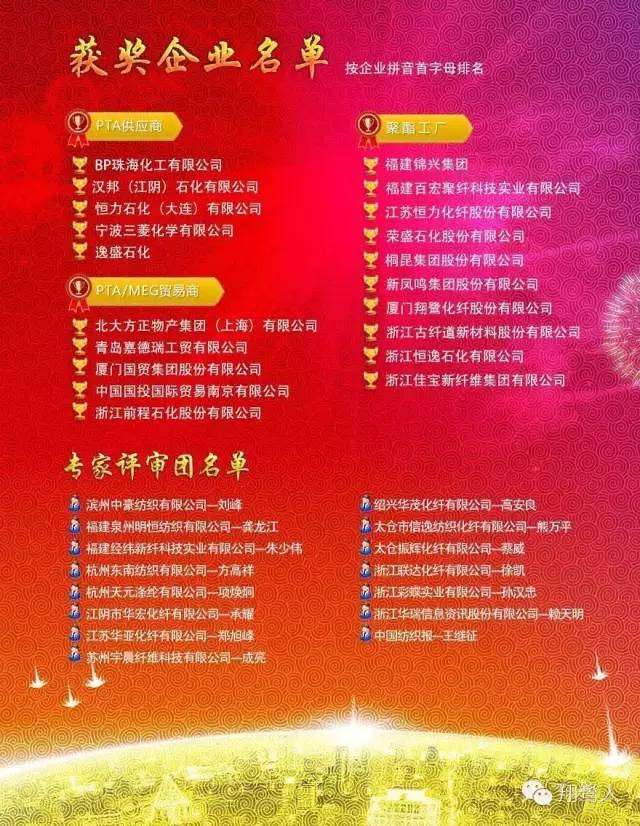翔鷺化纖榮獲“2015十佳聚酯產業(yè)鏈供應商”稱號3月24日,聚酯行業(yè)“十佳”評選頒獎儀式在“第十五屆中國杭州化纖論壇”上舉行,廈門翔鷺化纖股份有限公司榮獲“2015十佳聚酯產業(yè)鏈供應商-十佳聚酯工廠”稱號,原料采購部尾川有康代表我司上臺領獎。 “中國聚酯行業(yè)十佳供應商”是對聚酯行業(yè)眾多供應商中的優(yōu)秀企業(yè)的充分肯定和褒獎,獲獎供應商需同時滿足財務狀況良好、管理水平完善、商業(yè)信用優(yōu)異,具備優(yōu)秀的運營能力、決斷能力、創(chuàng)新能力、盈利能力、可持續(xù)發(fā)展能力,市場競爭力強、肩負社會責任等十項判斷標準。本次物產集團獲此殊榮,既是對企業(yè)發(fā)展模式的肯定,亦是對我司化工能源團隊積極努力與拼搏創(chuàng)新精神的褒獎。 本次活動由浙江華瑞信息資訊股份有限公司(中國化纖信息網)主辦,旨在感謝在2015年度對中國聚酯行業(yè)做出重大貢獻的行業(yè)翹楚,經過主辦方嚴格篩選,共有34家企業(yè)參與了PTA供應商、聚酯工廠和PTA/MEG貿易商三個組別的評選。華瑞資訊官方微信“CCFinfo”對本次活動進行了全程跟蹤報道。據騰訊微信平臺投票情況統(tǒng)計,投票微信頁面閱讀量超過20萬人次,微信轉發(fā)14萬人次,收到有效投票101736票(包括企業(yè)微信增值票數和專家團投票)。同時,有3.5萬人次通過留言或直接回復的方式支持本次活動,受到了業(yè)界的廣泛關注。 本次獲獎的企業(yè)不僅在“第十五屆中國杭州化纖論壇”現(xiàn)場被授予2015年度中國聚酯業(yè)十佳供應商證書,還將享有在中國化纖信息網及CCFgroup“中國聚酯十佳供應商”欄目進行圖標鏈接,有助于樹立良好的企業(yè)品牌形象和收獲更多的社會影響力。 |